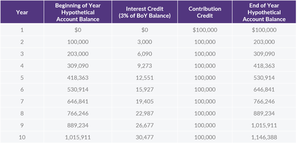 A great advantage of a cash balance plan over a traditional defined benefit plan is the predictability of the amount of assets needed at retirement. Robert (the owner and only employee of Robert Smith, Inc.) is 52 years old, starts a cash balance plan with a contribution credit of $100,000 per year, and plans to retire in 10 years. With a fixed interest crediting rate of 3% per year, we know his account balance at age 62 will be $1,146,388. That means that regardless of the actual return on assets, the final lump sum amount is $1,146,388.