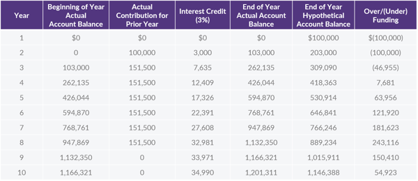 So, if Robert contributes the maximum for years two through seven, he is done contributing. With assets at just over $1 million at that point, the annual interest credit over the three remaining years until he pays out the lump sum (after year 10) will push total assets to $1,202,311, which is almost $55,000 more than plan liabilities.